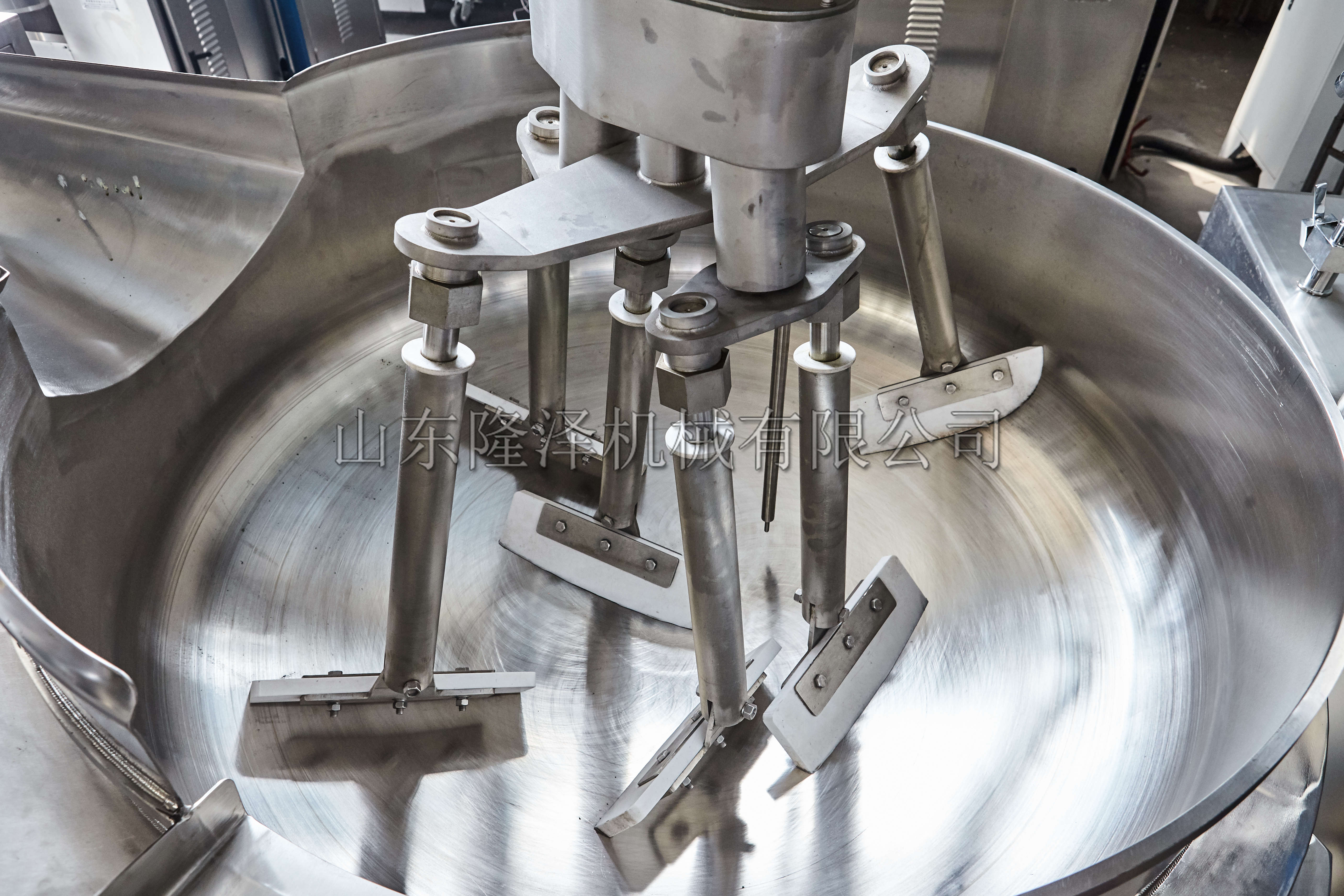 3、搅拌方式:采用特殊的倾斜式传动,使用的行星式搅拌器与锅体充分接触。搅拌系统采用自转公转相结合的方式,其传动比为不整数传动比,保证锅内无任何搅拌盲点。使用传动与密封结构,使传动部分与锅内洁净、卫生。具有升温快,加热均匀及加热温度易于控制等优点。