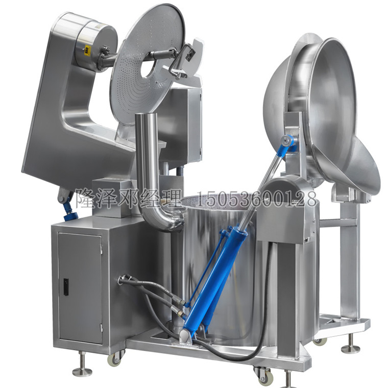 本设备主要由锅体、底座、倾翻、搅拌臂与机架等部分组成。锅体全部采用SUS304不锈钢制作,加热部分由燃气灶组成。可倾翻部分由蜗轮、蜗杆、手轮与轴承座等组成。搅拌部分由电机、摆线针轮减速器,行星搅拌装置或支架、延长轴、连接套、浆叶用支承座等组成。转速可变频调速。