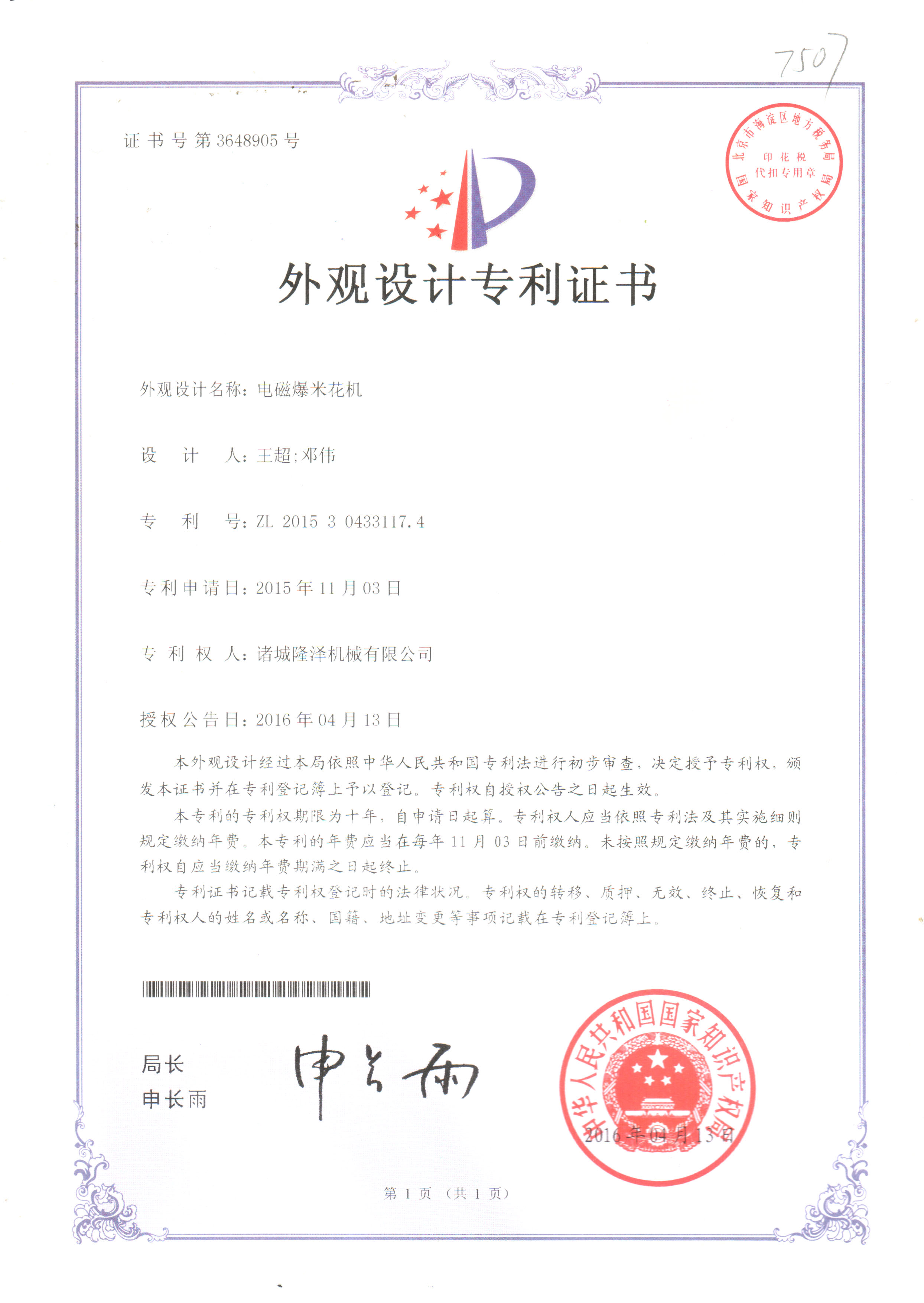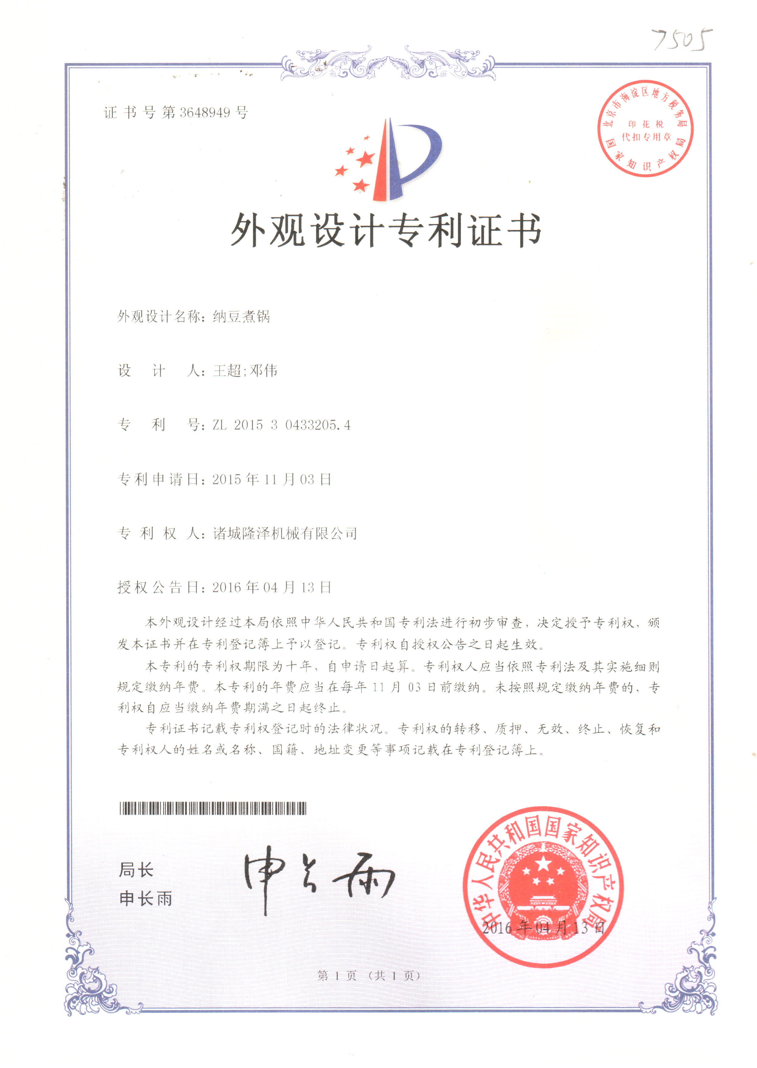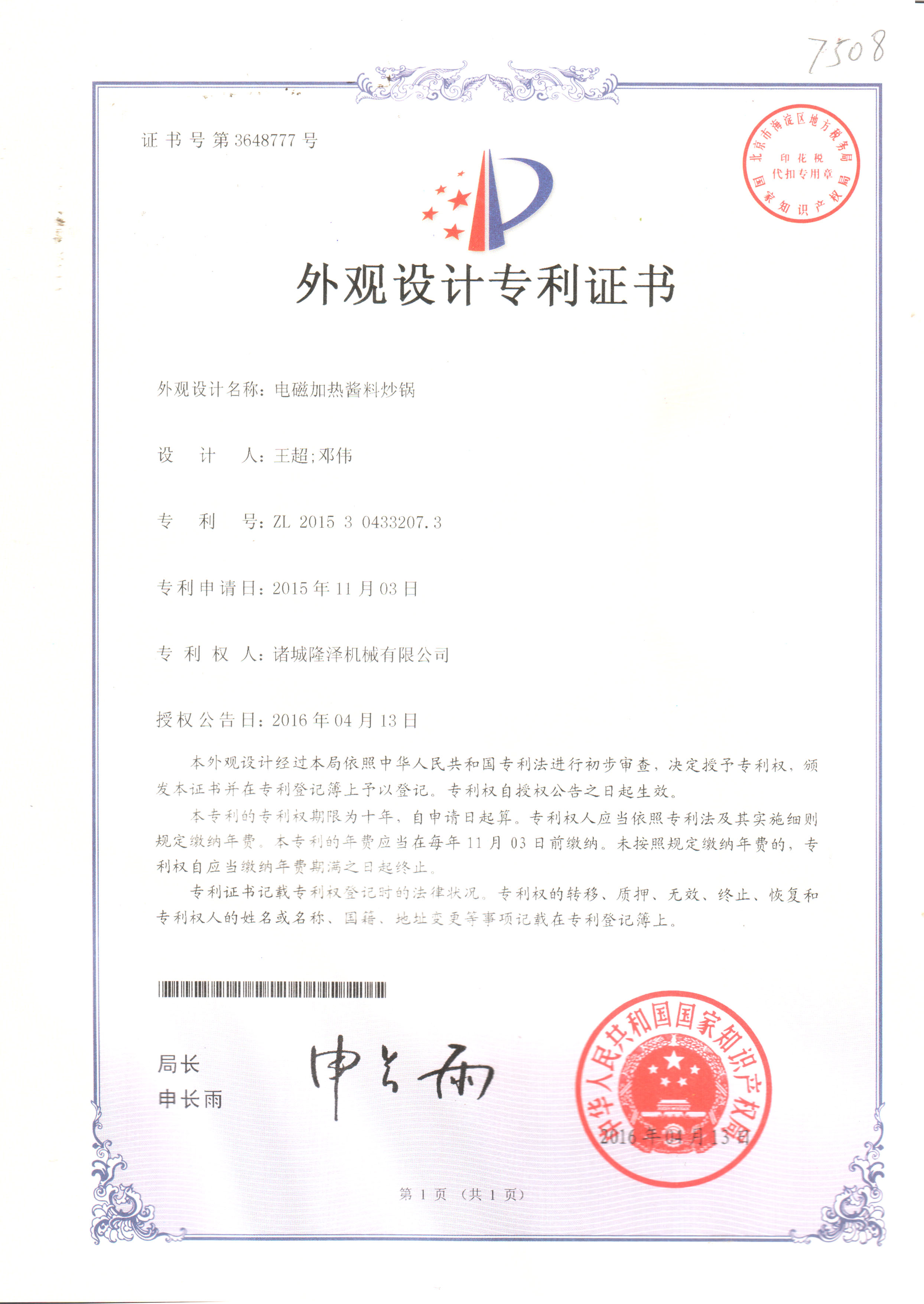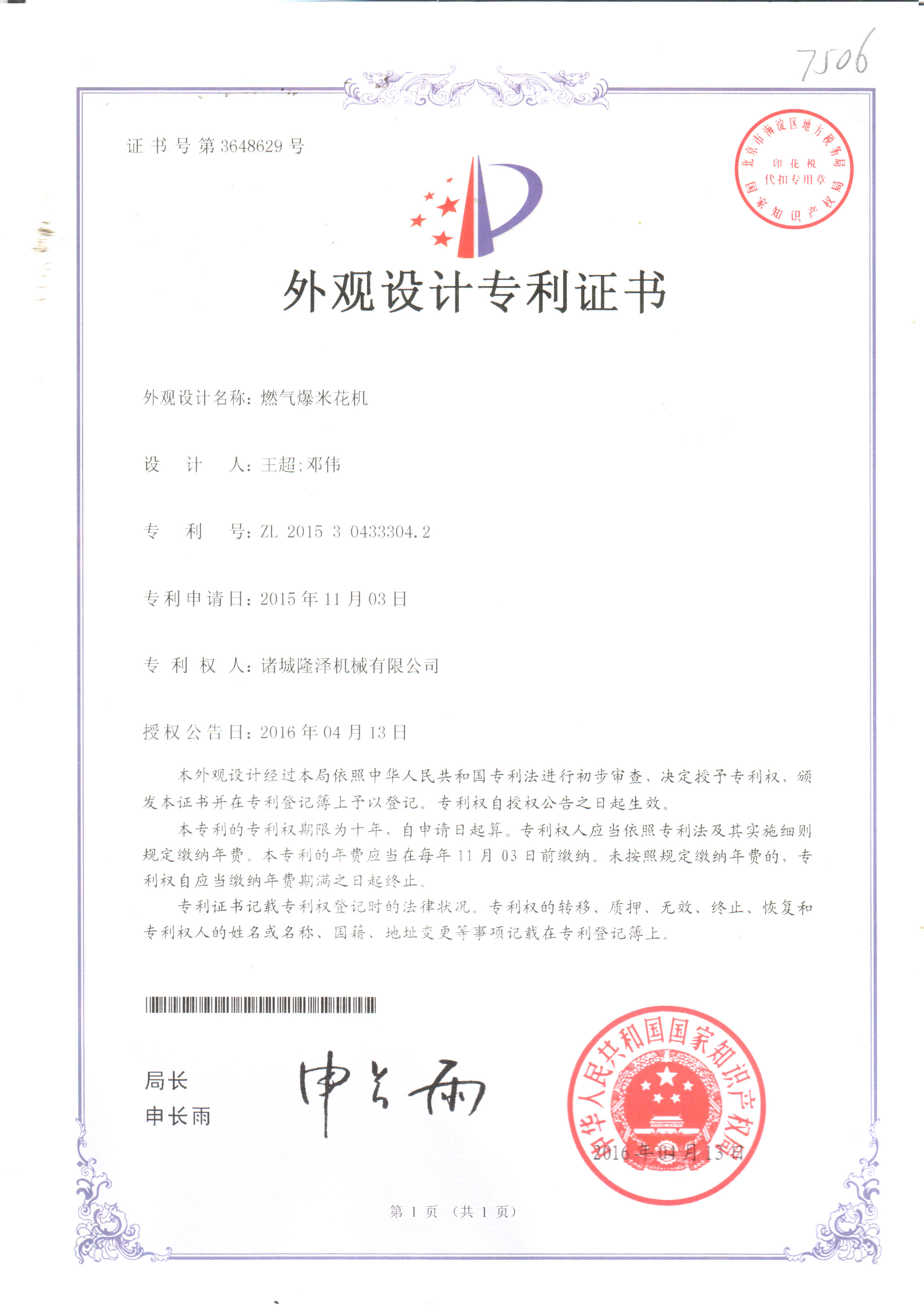 隆泽机械现已取得多项外观设计专利以及实用新型专利。专利号一同示出,可供查证。