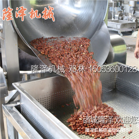 隆泽蜂蜜花生生产设备主要由内网筐、搅拌系统、内锅体和可倾架组成;内网筐、内锅体是由专用模具整体冲压成型,搅拌器刮边刮底搅拌,机械传动。本设备设有电机、电源指示、锅内油温由红外线测温实时显示油炸温度,搅拌电机功率为1.5KW。加热方式为:天然气、液化气、导热油电加热。