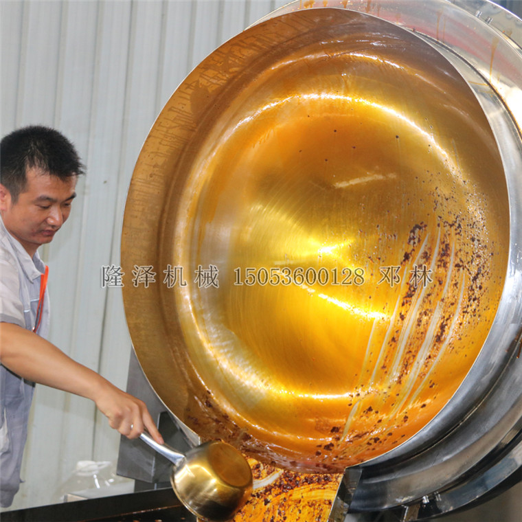 隆泽辣子炒锅是由我公司吸收德国先进技术,结合中国客户的需求特点,自主开发的产品。具有自动翻炒,可倾出锅的特点。自动翻炒,搅拌均匀,提高生产效率,降低能耗,节省能源。锅体固定,锅内菜肴随机械手做刮上抛下运动,机械自动翻炒,可通过变频器调速,提高翻炒速度。整个锅胆由SUS304制成,没有涂层,更安全,更方便清洗使用。